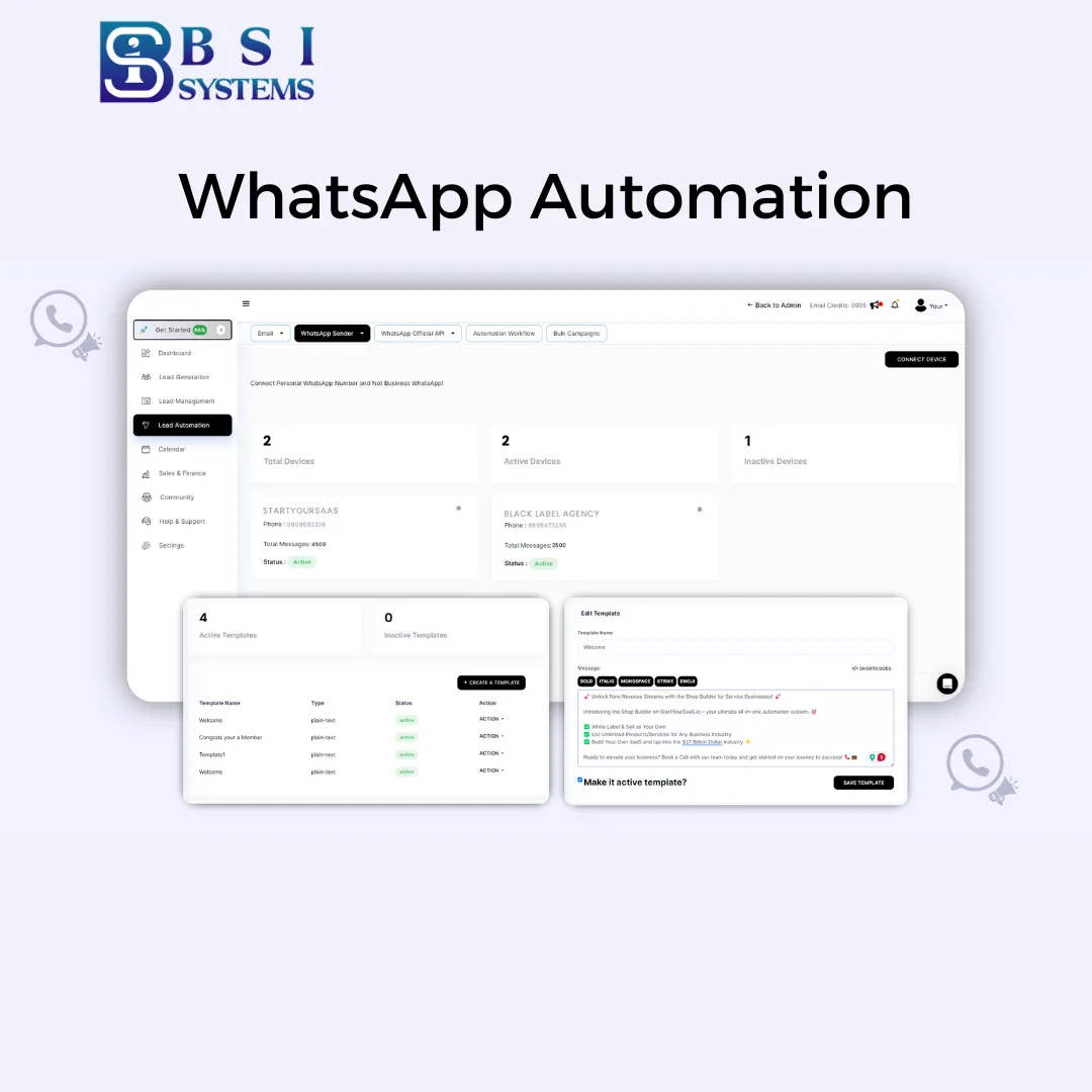 BSI Systems is an All-in-One Business Automation Platform that helps you manage leads, automate follow-ups, run WhatsApp campaigns, launch funnels, and even build your own SaaS brand - all from one simple dashboard. No coding, no tech struggle - just plug, play & grow your business like a pro.